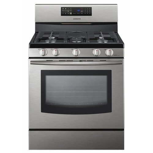 30" Freestanding Gas Range with 5 Burners and Convection Oven Samsung ranges have intuitive design to match any kitchen. The inductive cooking is safer than classic heating methods. The oven offers a convection heating base, so you know the oven will use as little energy as possible. Large Capacity: Extra-large 5.8 cubic foot oven accommodates everyday to extra large baking needs. The Split Oven Rack allows multiple oven configurations. Versatile cooktop: Five Burners including a large oval center and a dual 18K BTU power burner gives you ultimate control of your foods for serious and even cooking. Fan Convection Cooking: Fan convection cooks food faster producing juicier meats, flakier crusts and perfectly roasted vegetables. Features: Five Induction / Radiant Cook top Elements Self Cleaning Variable Broil Safety Lock Three Oven Racks with Convection Heating Hidden Bake Elements Wide Digital LED Display Touch Control One Year Warranty on Parts and Five Year Warranty on Sealed System Parts Sabbath Mode Specifications: 5.8 Cubic Feet Total Oven Capacity Cook top Elements: 5 Oven Racks: 3 56000 Total BTU Output Outside Dimensions: 29.9375" Wide x 46.5" High x 23.5625" Deep Oven Dimensions: 25" Wide x 21.125" High x 19" Deep For over 70 years, Samsung has been dedicated to making a better world through diverse businesses that today span advanced technology, semiconductors, skyscraper and plant construction, petrochemicals, fashion, medicine, finance, hotels, and more. Samsung Electronics, leads the global market in high-tech electronics manufacturing and digital media.